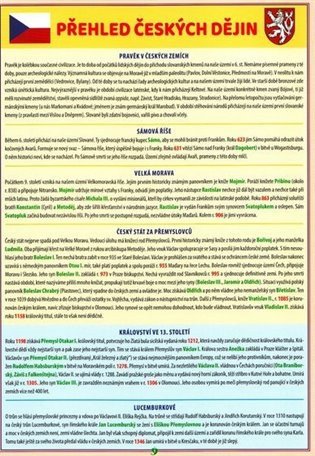 S tímto přehledem přehledem českých dějin se seznámíte s našimi dějinami chronologicky, v podobě vhodné pro opakování učiva. Přehledné členění, grafická úprava usnadňují snadnou orientaci v textu a lepší zapamatování. Ta nejdůležitější data a jména v rozložitelné tabulce, která se vejde do každého sešitu, či notýsku ! Tento malý pomocník se hodí každému, bez ohledu na to, jestli je to školák nebo ne!