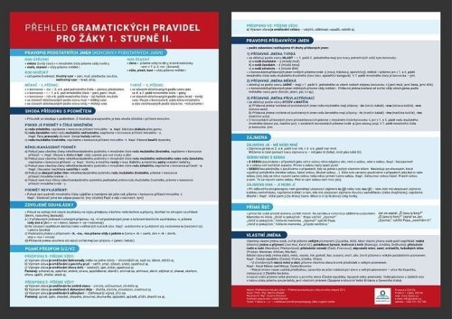 Přehledně zpracovaný přehled učiva pedagogy podle potřeby žáků Přehledová tabulka - Přehled gramatiky pro žáky prvního stupně II. (pravopis podstatných jmen, shoda přísudku s podmětem, zdvojené souhlásky, psaní předpon S,Z, VZ, pravopis přídavných jmen, zájmena, přímá řeč, vlastní jména) Přehledová tabulka slouží pro žáky prvního a druhého stupně. Přehledová tabulka je pomocníkem pro žáky se speciálními vzdělávacími potřebami Přehledová tabulka je vhodná pro žáky připravující se na víceletá gymnázia