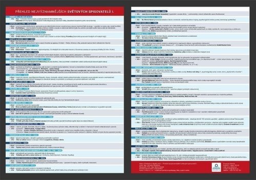 Přehledně zpracovaný přehled učiva pro pedagogy podle potřeb žáků. Přehledová tabulka učiva – Přehled světových spisovatelů I. - zpracovaný do přehledného souhrnu. Celkem 39 autorů, jejich život a nejvýznamnější díla pro snadné zapamatování. Tabulka je dobrým pomocníkem do hodiny literatury na druhém stupni základní školy. Přehledová tabulka slouží pro žáky prvního a druhého stupně. Přehledová tabulka je pomocníkem pro žáky se speciálními vzdělávacími potřebami Přehledová tabulka je vhodná pro žáky připravující se na víceletá gymnázia