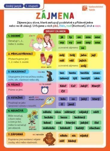 Přehled ZÁJMENA pro 1. stupeň základní školy, v jedné tabulce, která se vejde do každého sešitu či notýsku. Tento bohatě ilustrovaný a přehledný malý pomocník se hodí všem, bez ohledu na to, jestli je to školák, nebo ne.
