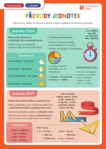 Přehledová tabulka: Převody jednotek pro 1. stupeň základní školy, v jedné tabulce, která se vejde do každého sešitu či notýsku. Tento bohatě ilustrovaný a přehledný malý pomocník se hodí všem, bez ohledu na to, jestli je to školák, nebo ne.