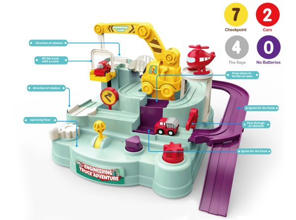Překážková dráha. Rozměry 24x24x17 cm. Rozměry auta 3,5x2,5x3,5 cm. 4 ovládací prvky (kolečka, páčky). Součástí 2 auta. Věk: 3+