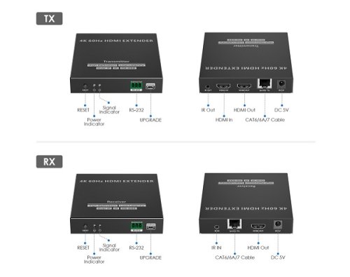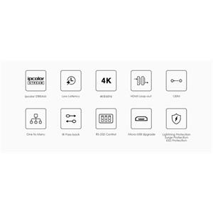Zařízení umožňuje po jednom síťovém kabelu nebo prostřednictvím LAN sítě přenést nekompreovaný 4K@60Hz HDMI signál až na 120m a současně IR signály.