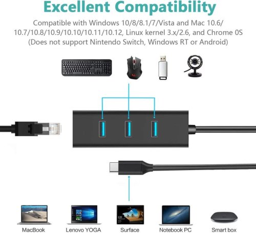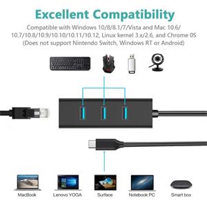 Převodník, který umožní připojit Váš počítač s portem USB typu C do internetu nebo k lokální síti pomocí kabelu s RJ45 a navíc umožňuje zapojit tři USB3.0 periferie jako USB disk, tiskárnu, klávesnici a myš