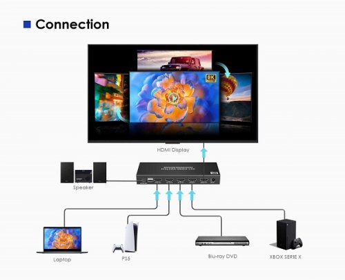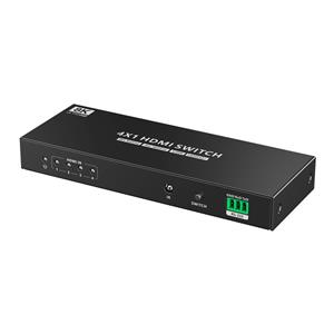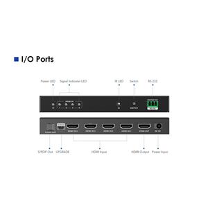 4 HDMI zařízení sdílí 1 HDMI výstupní zařízení (obrazovku). Výběr zařízení tlačítkem nebo dálkovým ovládáním.