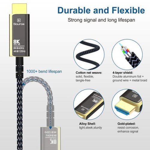 *HDMI 2.1 Ultra High Speed aktivní optický fiber kabel, podporuje HDMI2.1 nebo nižší HDMI2.0 a HDMI1.4 *Podporuje Ultra High Definition rozlišení 8K@60Hz, 4K@120Hz, YUV 4:4:4 *Maximální datový přenos: 48 Gb/s *Hybridní optický kabel o průměru 5mm - 4x optické vlákno OM3 + 7x vodičů *Pozlacené konektory: HDMI typ A (19pinů) male <=> HDMI typ A (19pinů) male *Rozlišení: 8K UHD (7680p) při 60Hz, 4K UHD (3840p) při 120Hz nebo nižší podporované formáty 1080p FULL HD/1080i/720p/720i *Optický kabel je zpětně kompatibilní k HDMI 2.0a, 2.0, 1.4 a nižší verzi *Podporuje eARC, ARC, HEC, EDID, DDC *Podporuje CEC ( Consumer Electronics Control ) *Podporuje HDR (High Dynamic Range) *Podporuje VRR (Variable Refresh Rate), ALLM (Auto Low Latency Mode) *Podporuje 4:4:4 barevný Subsampling *3D video po HDMI připojení *Podporuje HDCP1.4/HDCP2.2/HDCP2.3 *Multi-Dimensional Audio Formats Supported (Dolby Atmos and DTS:X etc.) *Dolby TrueHD and DTS-HD Master Audio Bitstream Compatible *Podporuje Audio Return Channel (ARC) *Kompatibilní s HDMI Ethernet Channel (HEC) *Support EDID *Kompletní napájení se sběrnice HDMI spotřeba menší 250mW, nepotřebuje externí napájení *Tloušťka optického kabelu 5mm *Optické vlákno: OM3 Multimode Fibre Optic *Kabel potažen opletem *Pozlacené konektory v kovových krytkách *Flexibilní optický kabel pro malý radius ohybu: 20mm *Optický kabel je zabalen v papírové krabici s návodem a polepen štítkem s popisem a EAN kódem *Rozměry konektoru: VxŠxH / 51x19x9mm (rozměry konektoru bez průchodky) *Podpora konzole Sony PS5 *Barva kabelu: černo/bílý oplet *Barva konektoru: černá/béžová *Délka kabelu: 5 m