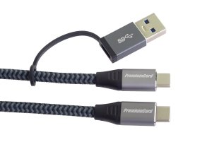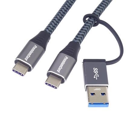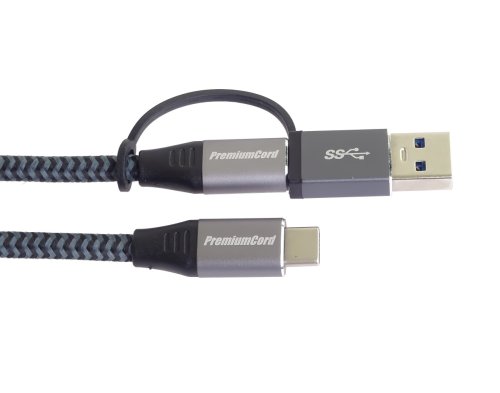 PremiumCord USB-C kabel ( USB 3.2 GEN 2x2, 5A, 100W, 20Gbit/s ) hliníkové krytky konektorů, bavlněný oplet + redukce USB-C/USB A 2m - První konektor: USB 3.2 typ C samec - Druhý konektor: USB 3.2 typ …