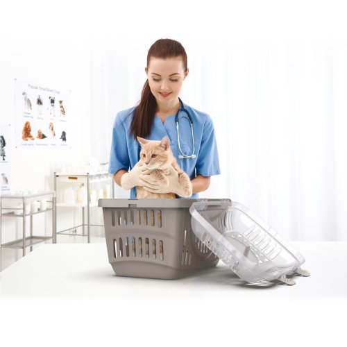 Plastová přepravka s horním otevíráním a transparentním víkem pro snadnou kontrolu zvířete.