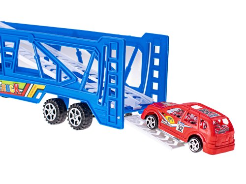 Přepravník aut 38 cm na setrvačník s auty 5 ks volný chod - mix barev (červený přepravník, žlutý přepravník)