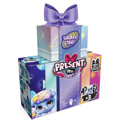 Zatáhni za visačku a proměň balení v útulný domeček ve kterém čeká roztomilý plyšák Present Pets Mini. Balení obsahuje 3 Present Pets Mini, 1 certifikát osvojení, 2 psí boudy, 1 přepravku, 3 listy samolepek, instrukce. Vhodné od 5 let.