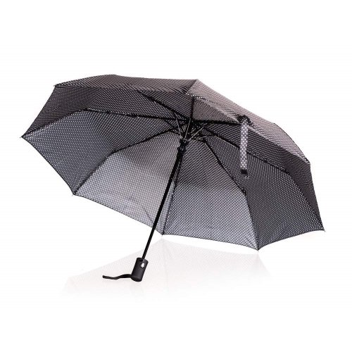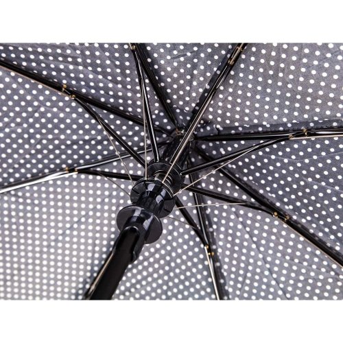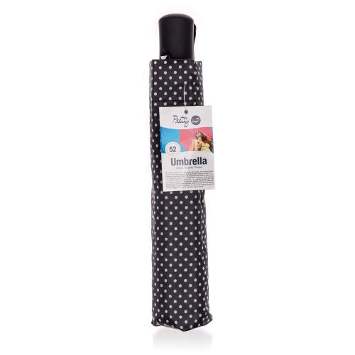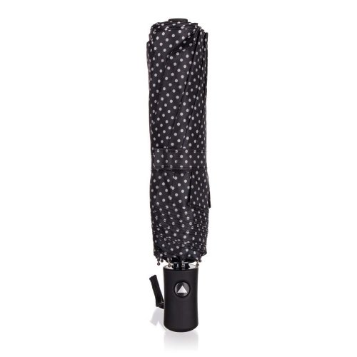 Deštník skládací 52 cm v černé barvě s puntíky, slouží k ochraně proti dešti a přímému slunci. Je vyroben z nepromokavého materiálu polyester. Má ochranu proti poškození větrem, automatické otevíraní a je skládací pro snadné uskladnění.