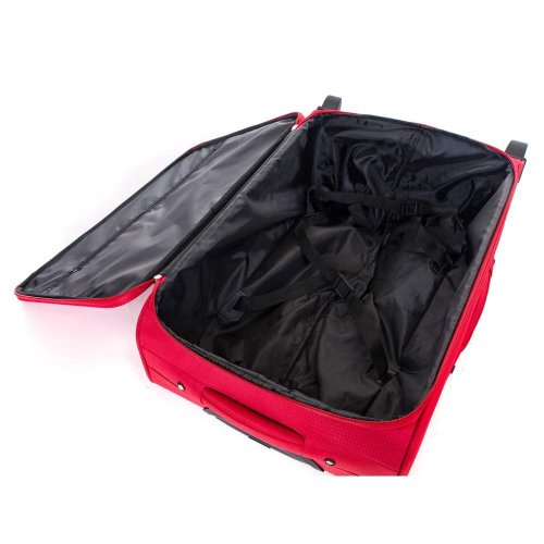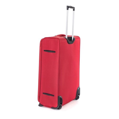 Cestovní textilní kufr TEX15 velikosti L v červené barvě, je vyrobený z textilie, což ocení především cestovatelé, pro které je důležitá nízká hmotnost zavazadla. Je opatřený 2 kolečky pro snadné přemístění zavazadla. Kufr má 2 textilní madla (boční a horní) a 1 plastové s teleskopickou rukojetí s pojistkou proti zasunutí a možností nastavitelné výšky ve více polohách. Díky vůli textilie, je prostor kufru možné drobně přizpůsobit. Ve vnitřním prostoru naleznete jistící popruhy a vnitřní kapsu pro lepší fixaci a uspořádání vašich věcí. Dále má dvě vnější kapsy pro umístění drobnějších věcí. Kufr se uzavírá na zip. Nosnost cestovního zavazadla je 23 kg. Rozměry: 70 x 47 x 26 cm a výška kufru vč. koleček 73 cm. Objem: 85 l. Váha: 3,8 kg.