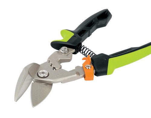 Převodové nůžky na plech, offsetové pro pravý střih. Jsou ideální pro stříhání různých odolných materiálů, včetně plechu, potrubí, sádrokartonových rohů, kovových svorníků, lišt, podhledů, římsových desek, okapových lišt, okapů a dalších materiálů. Mají čepele s patentovanou technologií PowerGear - převodový systém, který poskytne o 40 % více síly, zejména v nejtěžší části střihu. Offsetové čepele umožňují stříhání středem plátu, zatímco ruka je bezpečné mimo ostrý kov. Střižná kapacita: ocel válcovaná za studena až do tloušťky 1,214 mm nebo nerezovou ocel až do tloušťky 0,644 mm. Délka střihu: 13,97 cm. Výška: 35 mm, délka: 295 mm, šířka: 105 mm, hmotnost: 460 g. Záruka: 5 let.