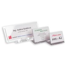 stolní identifikátor z průhledného pevného plastu se skládacím podstavcem uvnitř s čistou papírovou předlohou, na kterou stačí pouze dopsat potřebné informace lze využít jako nositel textů, popisků, …