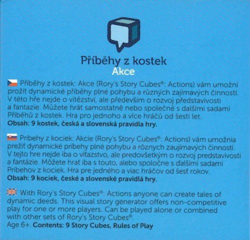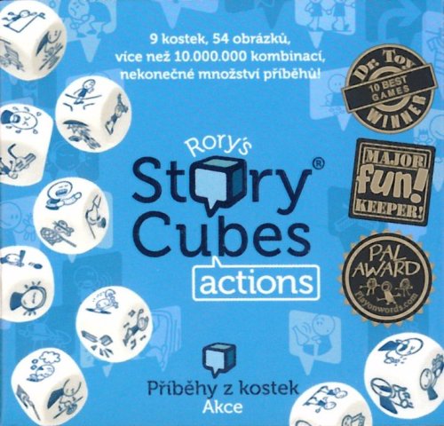 Příběhy z kostek (Rory´s Story Cubes) Vám umožní prožít dynamické příběhy plné pohybu a různých zajímavých činností. V této hře nejde o vítězství, ale především o rozvoj představivosti a fantazie. Příběhy z kostek: Akce je možné hrát samostatně nebo společně s dalšími sadami Příběhů z kostek.
