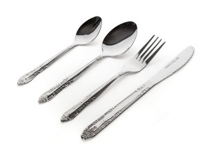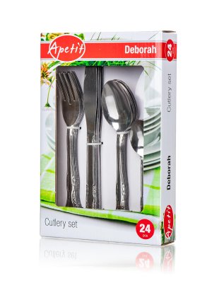 24dílná sada příborů APETIT DEBORAH se skládá: vše po 6 ks - nůž 20,9 cm, vidlička 17,6 cm, lžíce 17,3 cm, čajová lžička 13,2 cm.