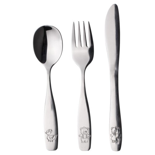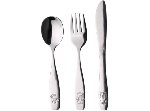 Dětský příbor ANIMAL z leštěné oceli, s vyraženými motivy zvířátek na rukojeti, sada 3díl. sada obsahuje: - jídelní lžíci 13,8 cm - jídelní nůž 17 cm - jídelní vidličku 14,5 cm