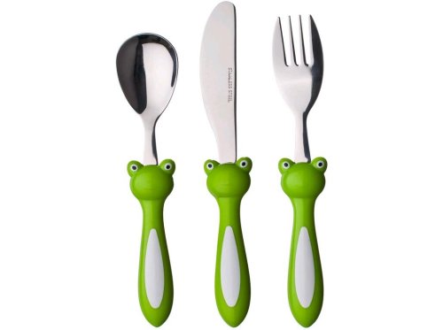 Sada tří nerezových příborů s plastovou rukojetí ve tvaru žáby.