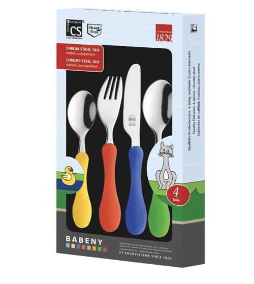 -Materiál: nerezová ocel/plast-barva: žlutá/zelená/modrá/červená/stříbrná-sada obsahuje:-jídelní nůž a vidlička-lžíce a čajová lžička