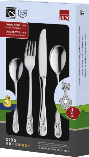 speciální ergonomie pro dětskou ruku-obrázky zvířátek pro snadné učení-možnost mýt v myčkách na nádobí-značka CS Kochsysteme, Solingen - Německo