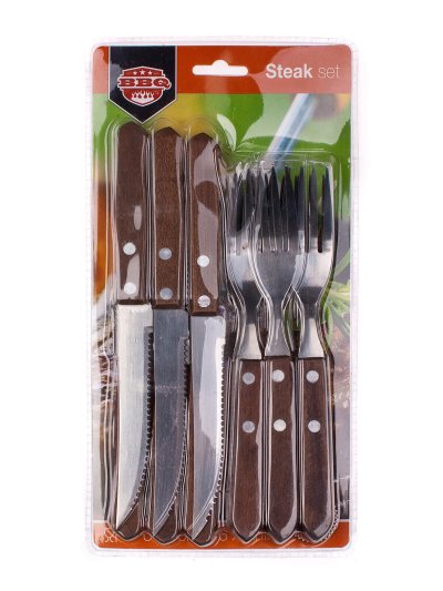 Příbor steakový BBQ (6 + 6 ks) nerez, dřevěná rukojeť, tmavá.
