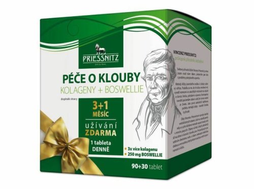 PRIESSNITZ® PÉČE O KLOUBY, přispívá díky obsahu boswellie k podpoře hybnosti a pružnosti kloubů, díky vitaminu C k normální tvorbě kolagenu, pro normální funkci chrupavek, a díky vitaminům K a D k udržení normálního stavu kostí. Dále je péče obohacena o tři, zákazníky žádané, typy kolagenů. Kromě hydrolyzovaných kolagenů typu I a II je tato speciální peče o klouby obohacena také o 40 μg nativního kolagenu typu II. Tedy o kolagen zachovány ve své přírodní podobě.