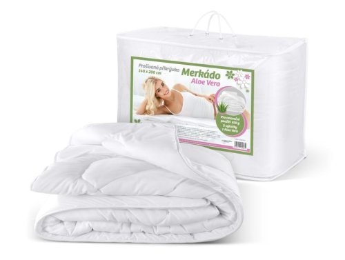 Prošívaná přikrývka Merkádo Aloe Vera letní materiál 100% Polyester 495g prodloužená - 220cm délka letní přikrývka praní možné až na 95°C sušit na sníženou teplotu (60°) žehlit nedoporučujeme Lehká letní …
