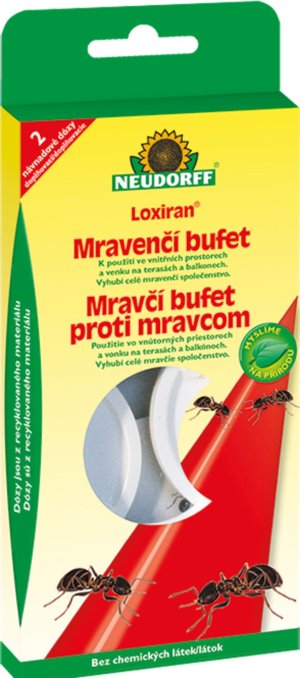 Mravenčí bufet v podobě doplňovacích návnadových dóz je vhodný k odstranění mravenců na terasách, balkónech a v obytných prostorech. Účinnou látkou je spinosad. Dózy jsou vyrobeny z obnovitelného materiálu a jsou určeny k opakovanému použití, snižuje se tak množství odpadu. Dózy je vhodné umístit do blízkosti mravenišť nebo na mravenčí stezky, nedávat na přímé slunce, aby nedošlo k rychlému vyschnutí návnady. Mravenci přijímají návnadový roztok velmi dychtivě a odnášejí ho do mraveniště. Tam jím pak krmí dělnice, larvy i královnu, a tím se vyhubí během 1 až 2 týdnů celé mravenčí společenstvo. V balení jsou 2 kusy.
