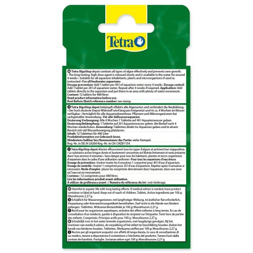 Také odolné štětinkovité a vlásečnicovité řasy budou spolehlivě zneškodněny, aniž by se ublížilo rybám nebo rostlinám. Dávkování: jako prevence: aplikujte 1 tabletu na 50 l vody do blízkosti vzduchovacího kamene. K odstranění stětinkovitých a vlásečnicovitých řas: dvojité dávkování. Tablety v sobě mají uloženou účinnou látku, která se postupně uvolňuje do akvária, ale nerozpouští se a udržují si svůj tvar. Po šesti týdnech už tablety žádnou účinnou látku neobsahují, a proto je z akvária vyjměte.