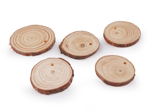 Přírodní dřevěný přívěsek s otvorem na zavěšení se hodí k dalšímu dotvoření. Je z obou stran rovný, po obvodu má kůru. Není barvený ani lakovaný, každý kus se může lišit jak barvou, tak kresbou dřeva. Přívěsky jsou vhodné pro další tvoření, pro výrobu madailí na dětské soutěže a tábory, na výrobu talismanů, visaček - třeba s čísly na adventní kalendář, jmenovek apod. K ozdobení můžete využít techniku malby, decoupage, lakování apod. V jednom sáčku je 5 ks koleček.