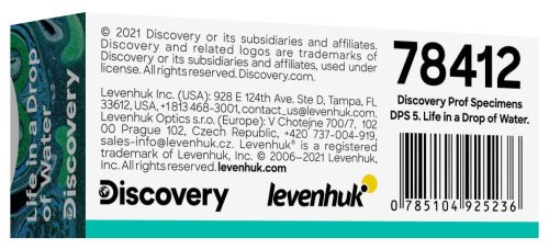 Sada předpřipravených histologických mikropreparátů Discovery Prof Specimens DPS 5 Život v kapce vody obsahuje 5 průhledných biologických vzorků profesionální kvality, které lze použít s jakýmkoliv biologickým mikroskopem. Tento set je pak zaměřený na miniaturní obyvatele sladkých vod, jako jsou rozličné bakterie, prvoci, členovci a plankton, kdy zahrnuje preparáty hronatky, buchanky, polypovce, různých druhů planktonu a také bakterií, které žijí v hnijící vodě. Jedná se o vynikající výukový materiál pro studenty zoologie, biologie, limnologie, chemie, histologie, medicíny, veterinárních věd nebo vodohospodářství a dalších obdobných oborů.