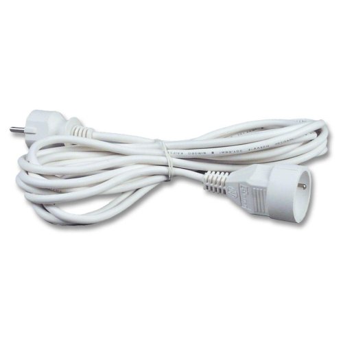 Prodlužovací kabel bílé barvy pro vnitřní použití. Zásuvka a vidlice jsou vyrobeny z plastu, kabel PVC.