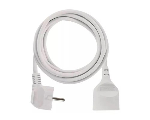 Prodlužovací kabel bílé barvy pro vnitřní použití. Zásuvka a vidlice jsou vyrobeny z plastu, kabel PVC.