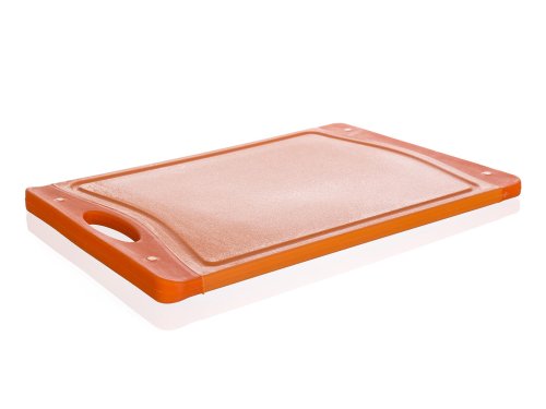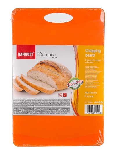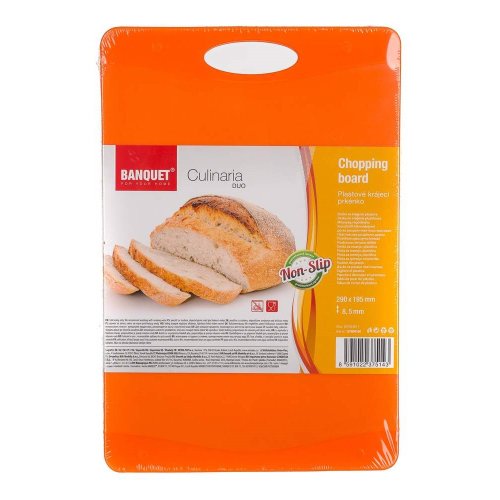 Prkénko krájecí plastové CULINARIA DUO, dvoubarevné provedení (dva odstíny oranžové), protiskluzová úprava. Prkénko se snadno udržuje a je vhodné pro krájení s ocelovými i keramickými noži.