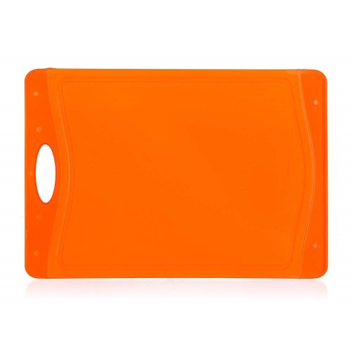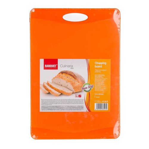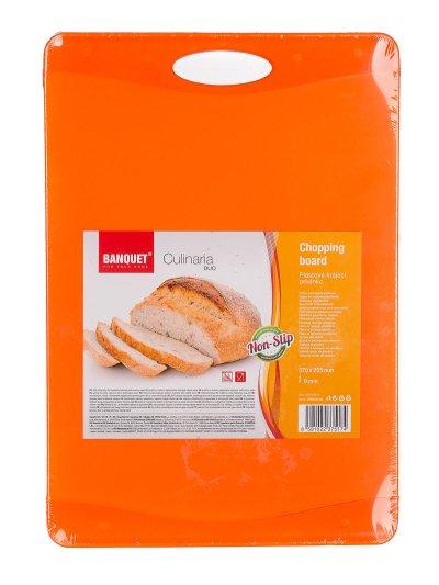 Prkénko krájecí plastové CULINARIA DUO, dvoubarevné provedení (dva odstíny oranžové), protiskluzová úprava. Prkénko se snadno udržuje a je vhodné pro krájení s ocelovými i keramickými noži.