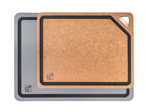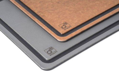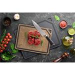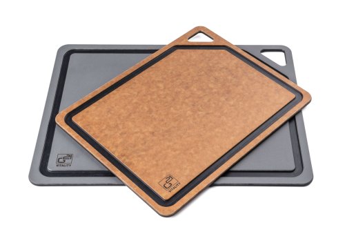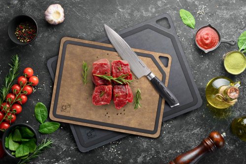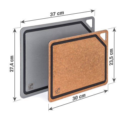 Univerzální prkénka EcoCut z biologicky rozložitelné celulózy spojují odolnost, šetrnost k ostří a moderní design. Snadno odolají i horkým hrncům, takže je můžete použít i jako podložku pod horké nádobí. Díky protiskluzové úpravě se prkénka při práci ani nehnou, zůstávají vždy pevně na místě. Praktická drážka po obvodu zachytí šťávy z masa i jiné tekutiny, díky tomu zůstane kuchyňská linka po krájení bez poskvrnky. V balení najdete rovnou 2 velikosti prkének (30 × 23,5 cm a 37 × 27,4 cm), které si zamilujete při přípravě masa, zeleniny, ovoce i bylinek.