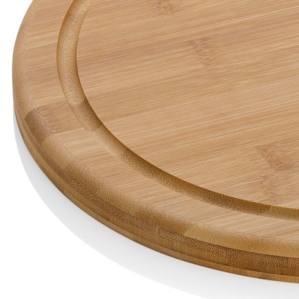 materiál: bambusové dřevo- velmi odolný přírodní materiál s lehkou údržbou- drážka zabraňuje stékání šťávy na pracovní desku- průměr: 30 cm- výška: 2 cm