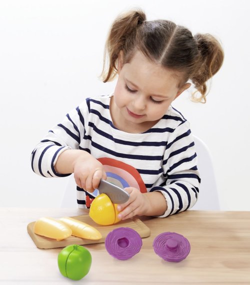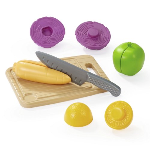Kuchynské prkénko na krájení s nožíkem a zeleninou. Rozměry: 15 x 8,5 x 20 cm.