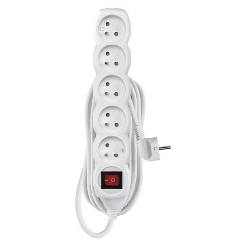 Bílý prodlužovací přívod, 5 zásuvka s vypínačem, délkou 5 m a průřezem vodiče 1 mm2 Vhodný pro maximální zátěž 10 A max Prodlužovací přívod 5 m na 230 V~ slouží k prodloužení elektrické energie tam, …