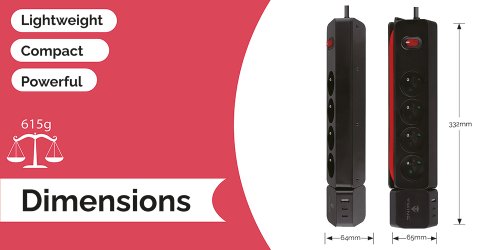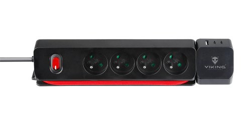 Technické specifikace: Model: Viking R43S AC 230V vstup: 230V, 16A, 50Hz, 3680W max. AC 230V výstup (4x): 230V, 16A, 50Hz, 3680W max. DC USB-A výstup (1x): 5VDC,Max.3A DC USB-C výstup (2x): 5VDC,Max.3A DC USB-A + USB-C + USB-C výstup: 5VDC 3,4A,Max:17W Hmotnost: 615g Rozměry: 33,2 x 6,4 x 6,5 cm Kabel: H05VV-F, 3G1,5mm2 Délka kabelu: 1,4 m Červený kabel: H05VV-F, 2X0,5mm2 Délka červeného kabelu: 1,28 m