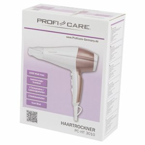 Fén HT 3010 je šetrný k vlasům a během sušení je nepoškozuje. Přesto je zvládne vysušit rychle, a to díky výkonu 2 200 W. Výhodou je ionizační funkce pro vytvoření antistatického efektu a lesklý vzhled vlasů. Fén lze provozovat ve 3 teplotách a 2 rychlostech. Nesmí chybět ani studený vzduch pro finální úpravy a stylování vlasů. Nasávaný vzduch proudí přes odnímatelný vzduchový filtr, takže veškeré nečistoty se v něm zachytí. Součástí balení je i difuzér otočný o 360 °. Závěsné oko na rukojeti slouží pro pohodlnější skladování. O bezpečnost se stará ochrana proti přehřátí.