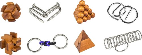 Napoleonovy dělové koule - Postav pyramidu z dělových koulí. Napoleon Bonaparte, vojenský génius své doby, ovládl Evropu díky silné armádě a těžkému dělostřelectvu. Poražen byl až v bitvě u Waterloo v roce 1815. Teslova cívka - Dokážeš uvolnit prsten ze spirály? Nikola Tesla, průkopník elektrotechniky, vynalezl slavnou Teslovu cívku, klíčovou součást raných rádiových a bezdrátových systémů. Mozartův basový klíč - Spojíš zpět všechny části hlavolamu? Wolfgang Amadeus Mozart složil přes 600 děl, z nichž mnohá patří ke klenotům klasické hudby. Jeho talent se projevil již v pěti letech. Chufuova pyramida - Zvládneš znovu postavit tuto slavnou stavbu? Faraon Chufu (Cheops) nechal postavit Velkou pyramidu v Gíze – stavbu, která dodnes fascinuje svět a zůstává jediným dochovaným divem antického světa. Drakeova koule - Dokážeš znovu složit jednotlivé díly? Sir Francis Drake, slavný mořeplavec a válečník, si před bitvou se španělskou armádou v roce 1588 prý ještě v klidu dohrál partii bowls. Cassiniho prstence - Oddělíš a znovu spojíš tyto nebeské kruhy? Italský astronom Giovanni Cassini objevil prstence Saturnu a čtyři z jeho měsíců. Pomohl také určit vzdálenost mezi Zemí a Marsem. Jeffersonovy hřeby - Zvládneš složit tento kovový hlavolam? Thomas Jefferson, třetí americký prezident, nebyl jen státník – založil i první výrobnu hřebíků v USA. Van Goghova schránka - Dokážeš rozebrat a znovu složit tuto barevnou krabičku? Vincent van Gogh vytvořil stovky děl, plných emocí a barev. Jeho styl ovlivnil vývoj moderního umění po celém světě.