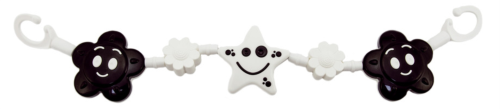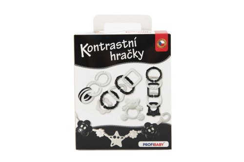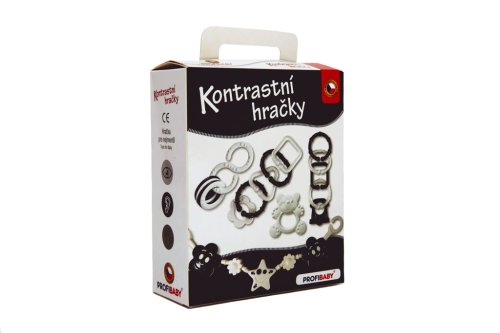 Set kontrastních hraček v dárkové krabičce v černobílém provedení. Tato barevná kombinace dokonale stimuluje smysl zraku u dítěte, které dosud nerozlišuje barvy. Chrastítka jsou tvarově koncipována tak, aby byla snadno uchopitelná dětskou rukou – při hře si dítě zároveň cvičí uchopovací reflex. Samozřejmostí ve výrobě je použití zdravotně nezávadných materiálů, splňujících náročné hygienické normy. Chrastítka jsou stálobarevná, bez ostrých hran, které by mohly dítěti při hře ublížit, a bez uvolnitelných malých částí, u nichž hrozí odlomení a následné případné vdechnutí či spolknutí dítětem.Balení obsahuje 4 výrobky v černobílé kombinaci. Vhodné pro děti od narození