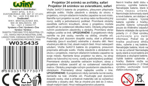 Projektor 24 snímků se zvířátky - Safari. Obsahuje projektor, 3 kotouče se snímky (celkem 24 snímků), 8 figurek safari zvířátek. Délka projektoru 11,5 cm, velikost zvířátek 5 - 7 cm. 3xAG13 baterie do projektoru součástí. Přepínač ON/OFF na projektoru. Zaostřovací prstenec na projektoru.