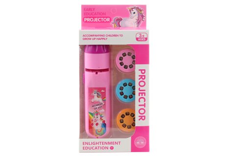 Plastový projektor na baterie. Součástí jsou 3 kotoučky s obrázky (celkem 24 obrázků). Po stisknutí tlačítka projektor promítá obrázky na zeď (nebo jinou bílou plochu). Napájení na 3 AG13 baterie (jsou součástí). Rozměry projektoru cca 13 x 3,5 cm. Rozměry balení cca 9,5x20,5x4 cm. Věk 3+