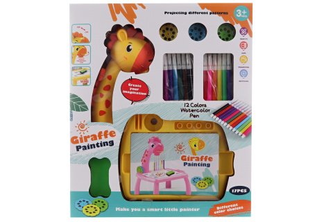 Projektor žirafa - napájeno na 3xAAA baterie (nejsou součástí balení). Sada obsahuje projektor, 12 barevných fixů, houbičku a 3 kotoučky s obrázky. Baleno v krabici. Rozměry balení 30x35x7 cm. Věk 3+