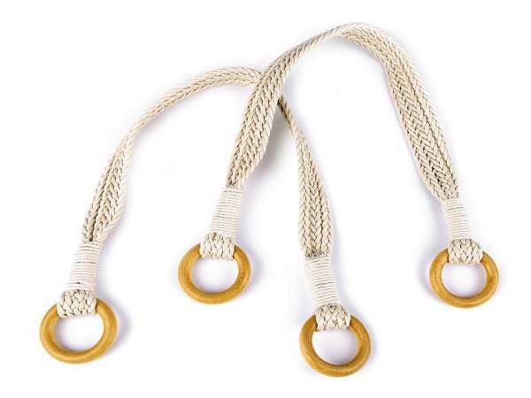 Proplétaná ucha na tašky jsou vyrobena z textilní voskované šňůry, která je na obou stranách zakončena dřevěnými kroužky. Ucha využijete při výrobě tašek nebo kabelek.Celková délka uch může pohybovat v rozmezí 50 - 54 cm.