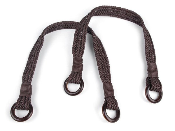 Proplétaná ucha na tašky jsou vyrobena z textilní voskované šňůry, která je na obou stranách zakončena dřevěnými kroužky. Ucha využijete při výrobě tašek nebo kabelek.Celková délka uch může pohybovat v rozmezí 50 - 54 cm.