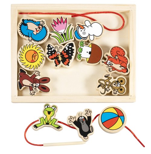 Dřevěné dílky s potiskem Krtka navlékáme na přiloženou šnůrku.