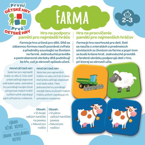 Balení obsahuje 12 dvojic velkých kartiček na pexeso a návod pro rodiče. Edice První dětské hry od výrobce TREFL jsou ideální pro hráče ve věku 2-3 let, kteří začínají objevovat svět kolem sebe. Jednotlivé hry pomáhají rozvíjet různé schopnosti malých hráčů a přitom plně uspokojují jejich přirozenou zvídavost.